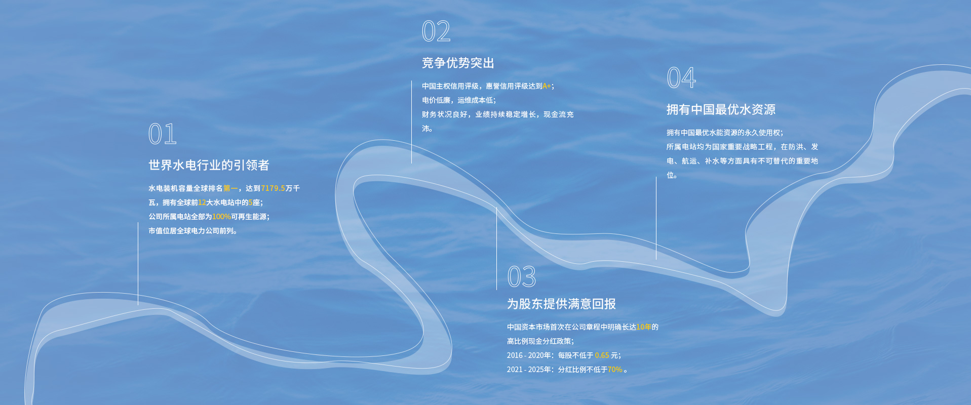 雷火竞技平台主要从事水力发电、投融资、抽水蓄能、智慧综合能源、新能源和配售电等业务,经营区域覆盖中国、秘鲁、巴西、巴基斯坦等多个国家,是中国最大的电力上市公司和全球最大的水电上市公司。雷火竞技平台运营管理的乌东德、白鹤滩、溪洛渡、向家坝、三峡、葛洲坝六座梯级电站,构成了世界最大清洁能源走廊,有效保障了长江流域防洪、航运、补水和生态安全,为我国经济社会绿色发展提供了强劲动能。